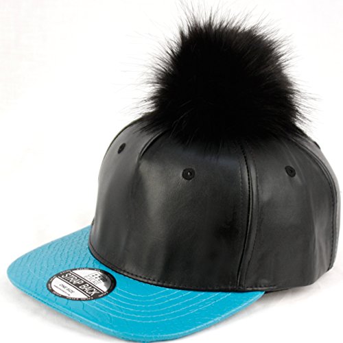 Faux Leather Fur Pom Pom Baseball Cap Strap Back (black/turquoise)